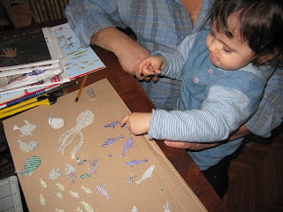 pek yapmadığımız birşey bir günde iki kuş avlamak ;) Oradan da babaanneye gittik. onlarla da epeydir görüşemiyorduk, hastalıklar ve kar yüzünden.. Yusuf her zamanki gibi bir ateş parçası. Çınar'la yaptığımız deniz aktivitesinin bir versiyonunu da onunla yaptık. Defterinden bir sayfayı maviye boyayarak deniz yaptı yusuf. Sonra gazeteden balıklar kestik ve yapıştırdık. Denizimiz bitince oynamak yerine tekrar yapalım diye tutturdu Yusuf. Yusuf böyle işte.. tekrarcı... ;))